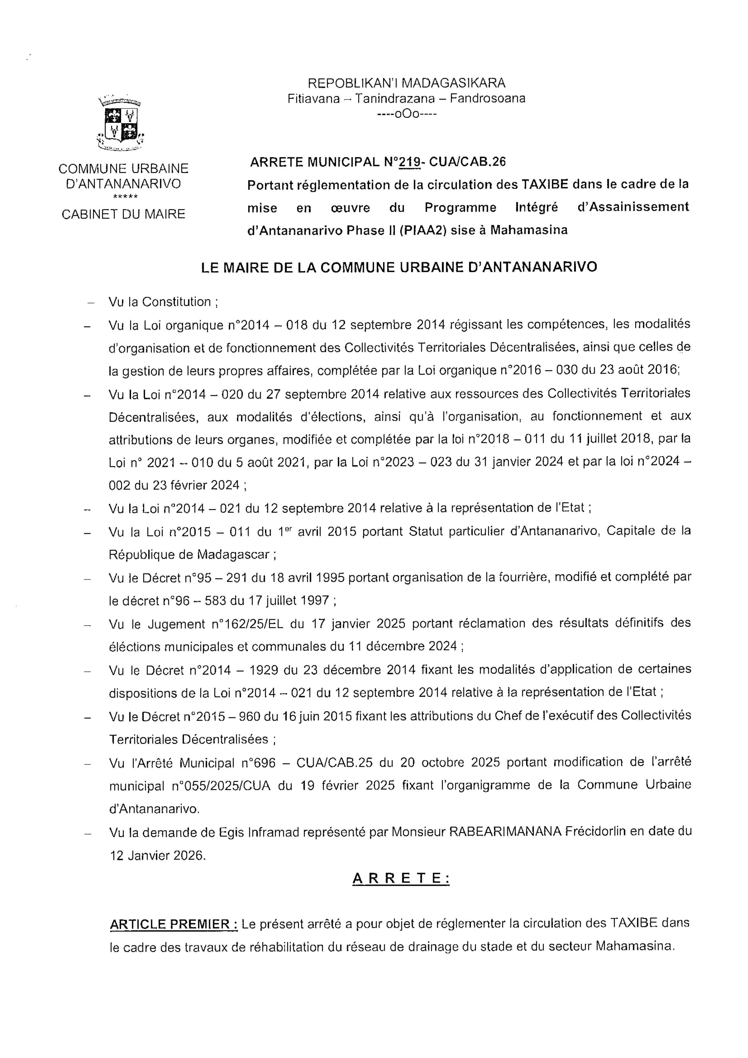 Conformément à l’arrêté publié par la Commune Urbaine d’Antananarivo, des modifications de la circulation seront mises en place dans la zone de Mahamasina, dans le cadre de la mise en œuvre du projet PIAA2.
