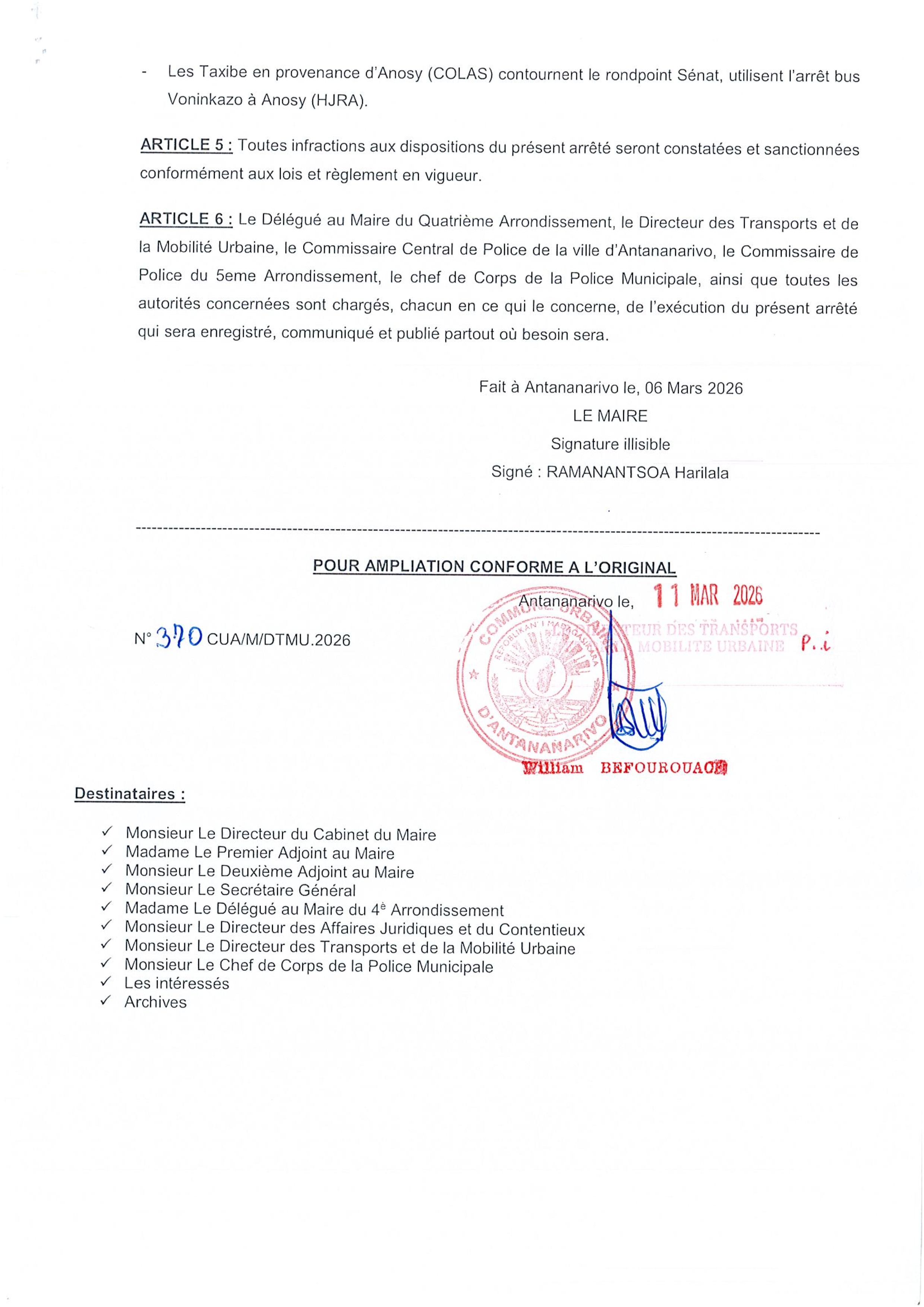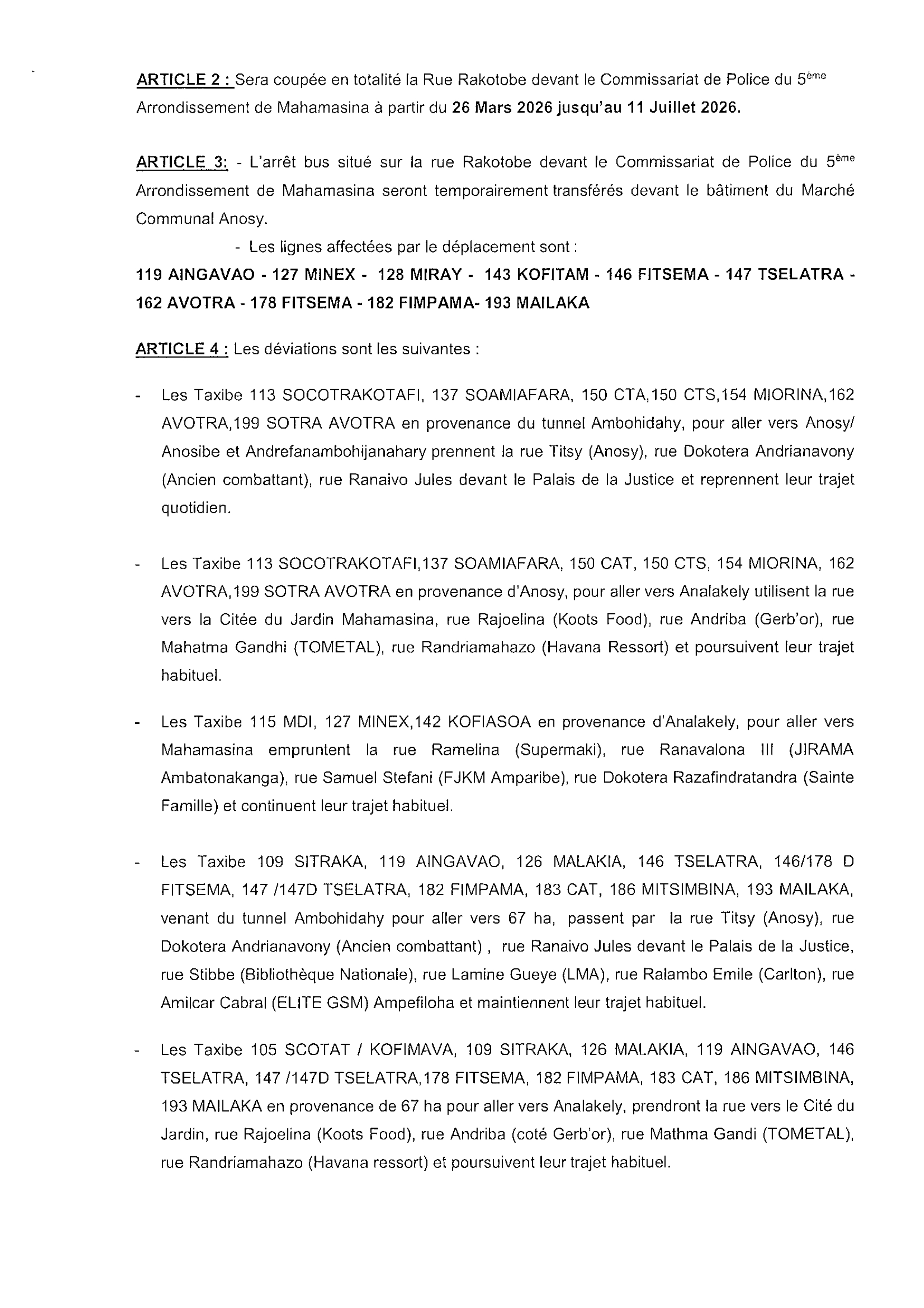 Du 26 mars 2026 au 11 juillet 2026, la rue Rakotobe, située devant le Commissariat de Police du 5ème arrondissement de Mahamasina, sera entièrement fermée à la circulation.