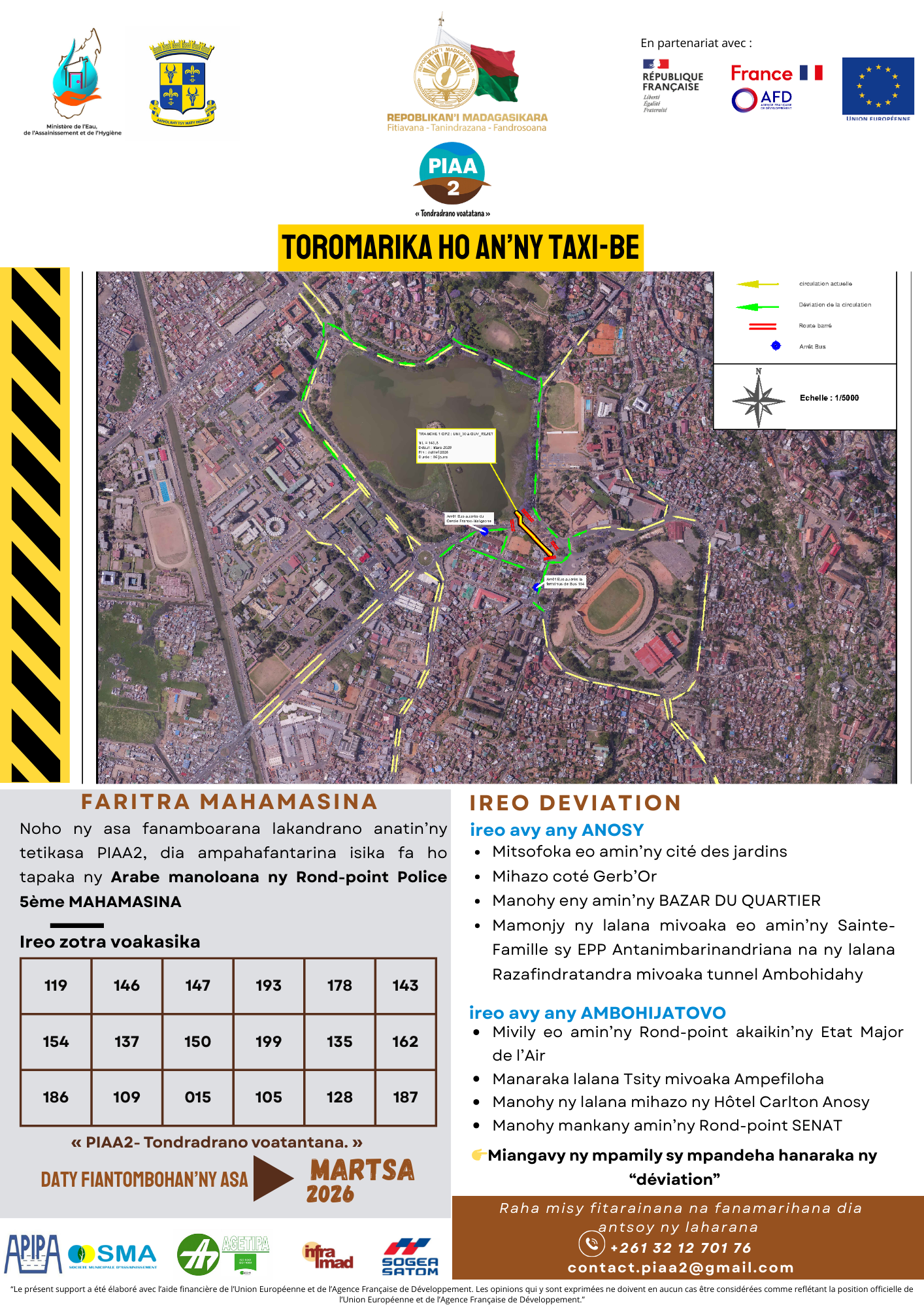Dans le cadre de la mise en œuvre du projet PIAA2, des travaux de réhabilitation de canaux seront réalisés, entraînant des coupures de circulation au niveau du Rond-point Police 5ème Mahamasina.